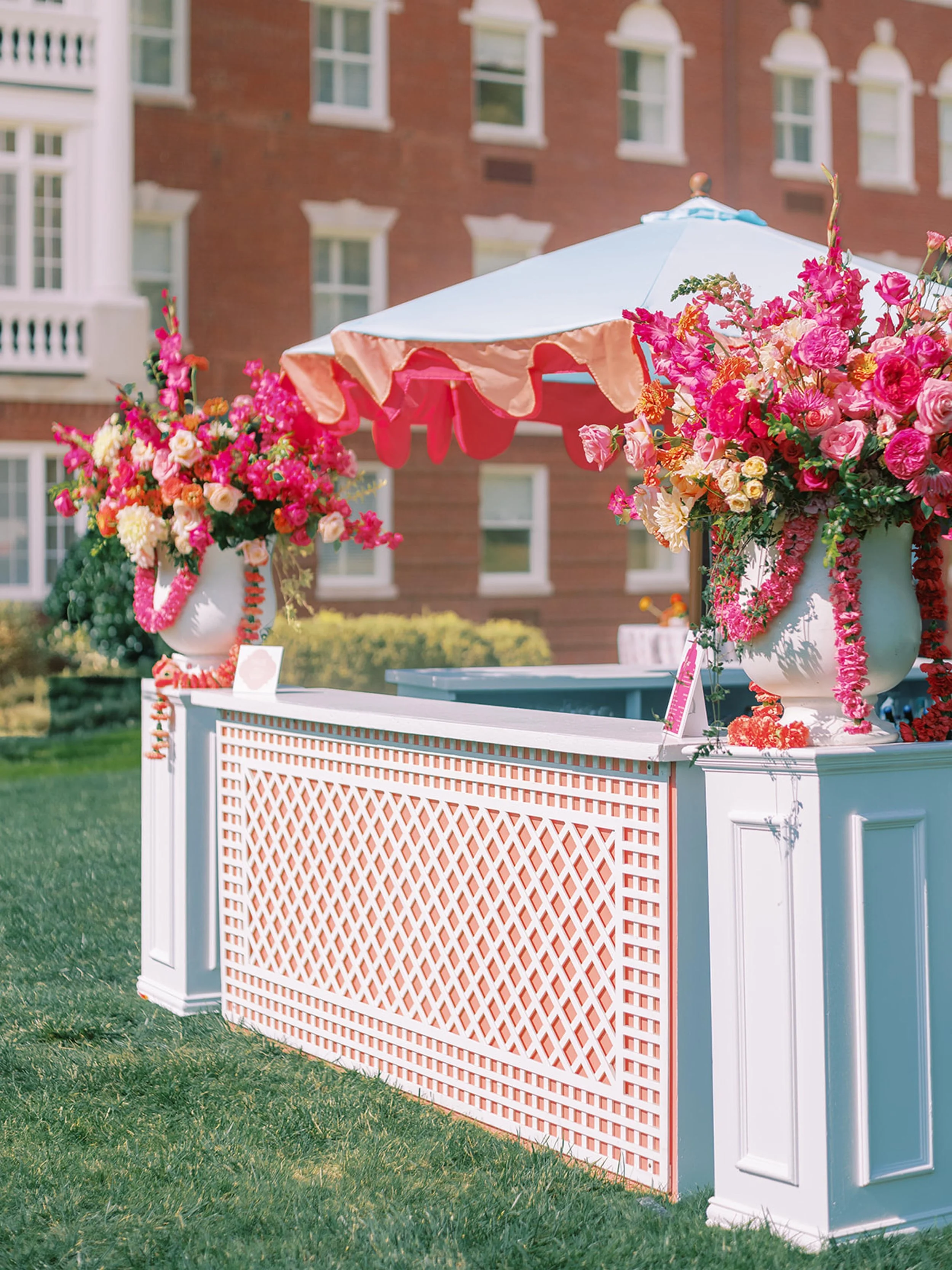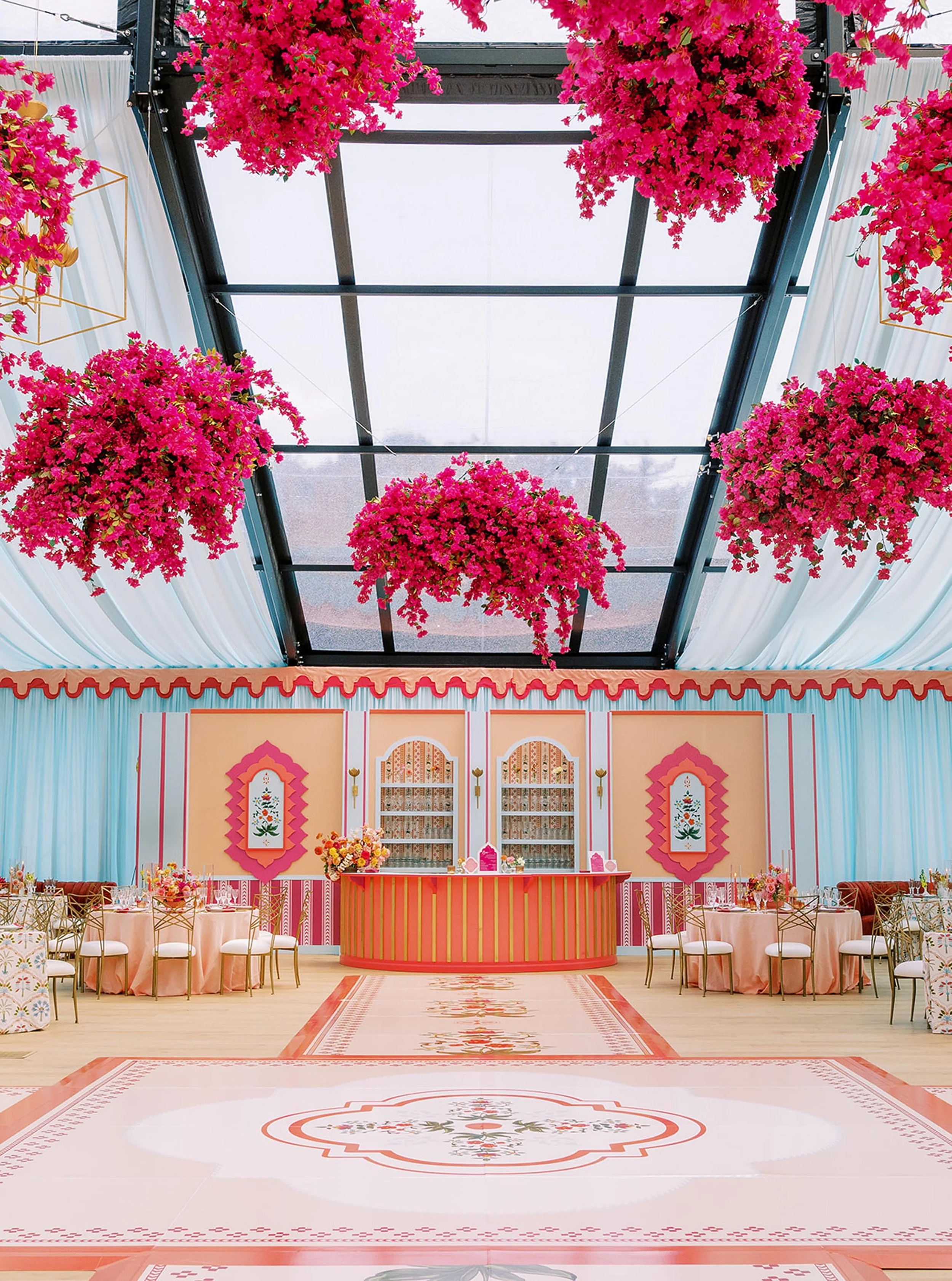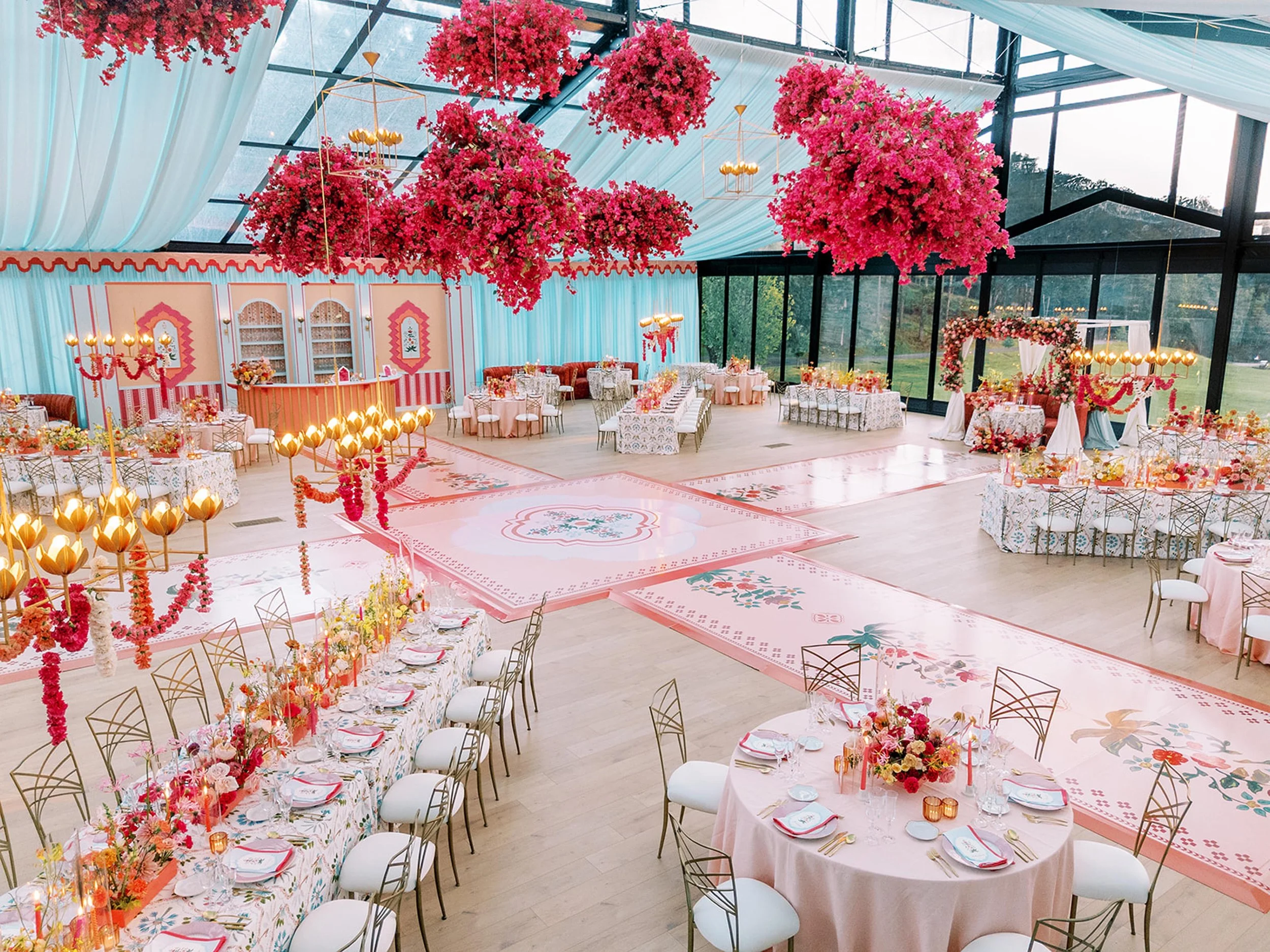 At the heart of the design was a symbolic “courtyard,” serving both as the ceremony aisle and as a gathering space for traditional dances before dinner. Its painted pathways represented their journey: two separate pasts, their present together, and the family they look forward to building.