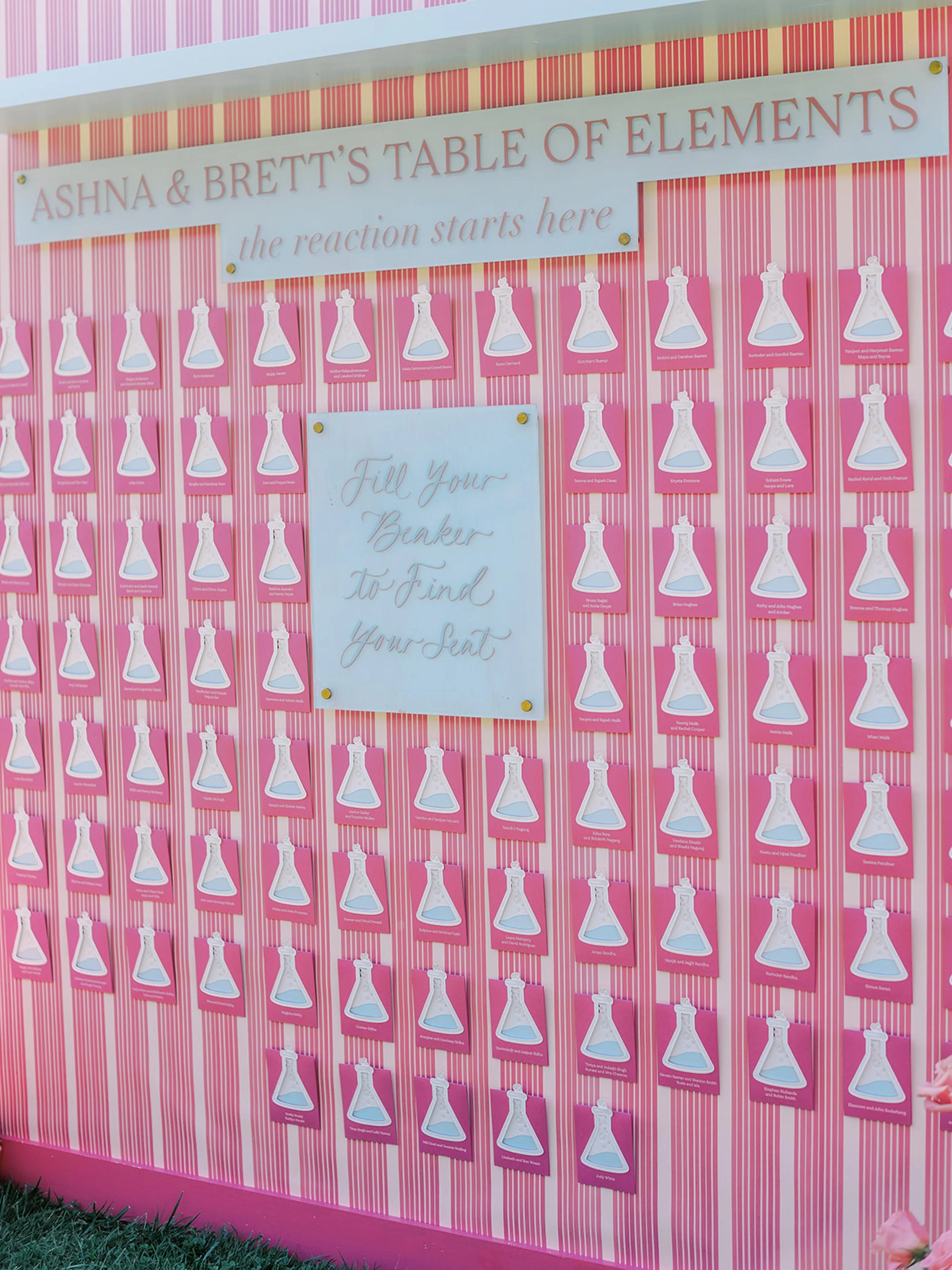 Guests were welcomed to cocktail hour with an interactive seating chart - “Ashna & Brett’s Table of Elements” - a playful nod to their shared careers as lab scientists. Each guest “filled their beaker” to reveal their table number, blending whimsy with personalization.