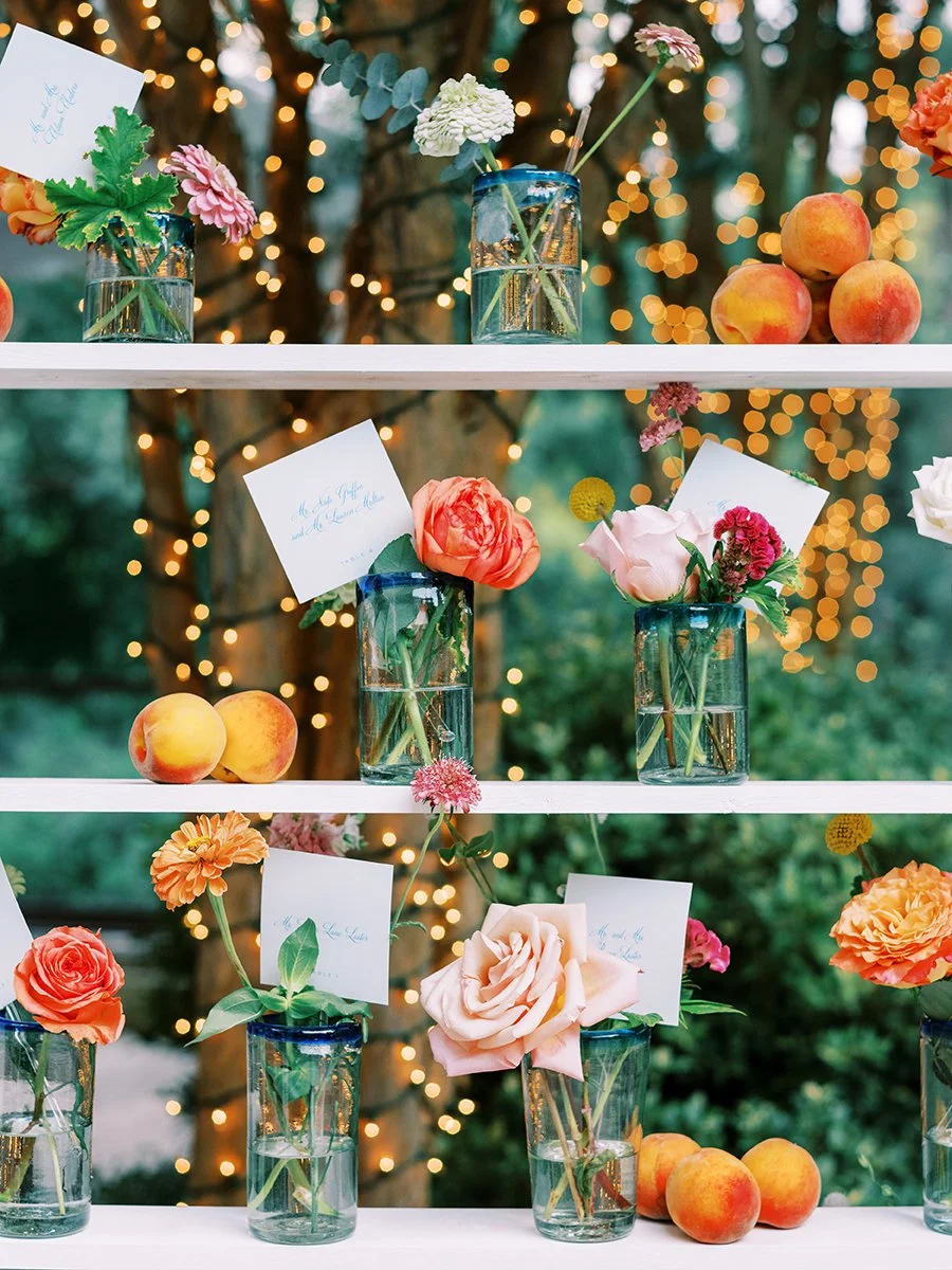 We created a seating chart display of escort cards tucked hand blown Mexican glassware that were turned into vases for bold summer blooms.