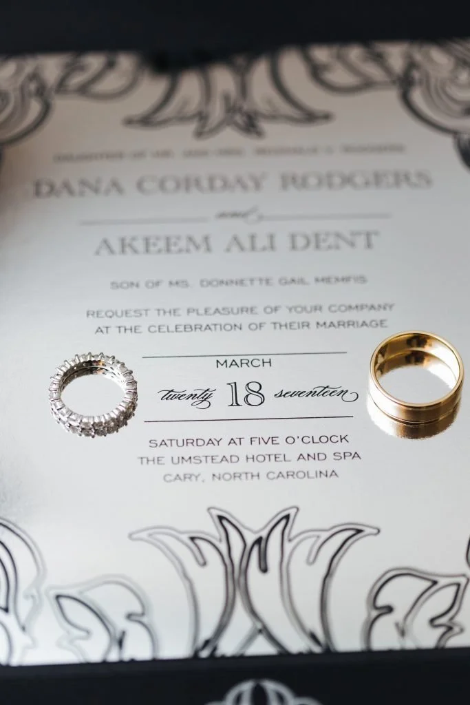 An evening full of love, laughter and lots of sparkle made for the most magical early Spring wedding at The Umstead Hotel and Spa. Lush blooms, crystal chandeliers and mirrored accents created a extravagant yet intimate setting for our sweet couple, Akeem and Dana, to say "I Do"! From mirrored stationery to a seven foot tall hanging wedding cake, each and every detail dreamed by the bride and groom was meticulously brought to life by the amazing team of vendors who made Akeem and Dana's day possible. As if this sweet couples love for one another was not enough, guests enjoyed surprise gown changes, delicious eats, personalized cookies, and lots of confetti throughout the evening, truly making this night one we will always remember!