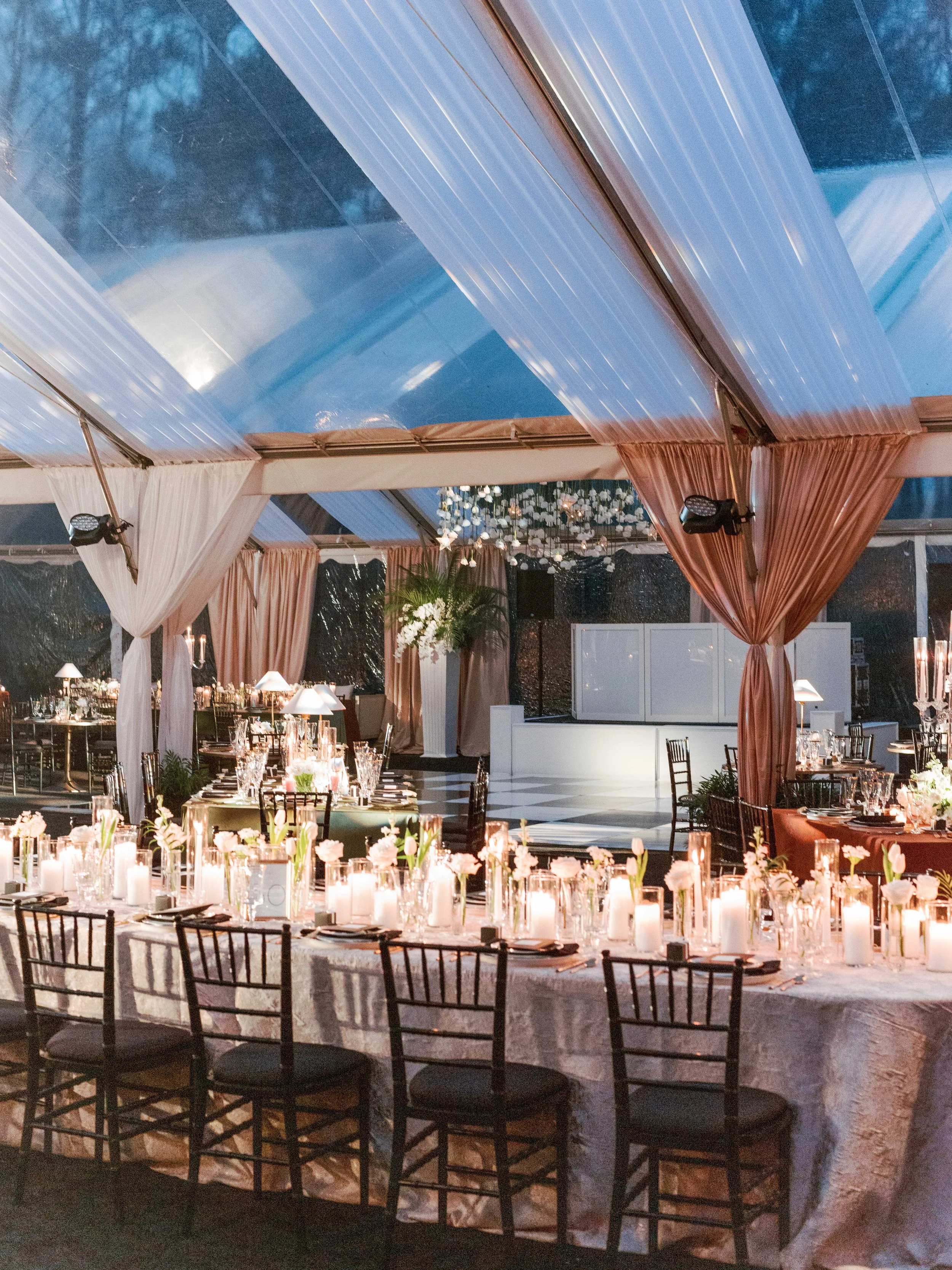 The plated dinner gala was to be held under a fully enclosed, heated tent on the back lawn of the venue. Curated Events was extremely generous with a donation of the tenting and rentals, complete with a ground-up build that started earlier that week. To ensure we had enough capacity for a seated dinner and 250 guests, we used two connecting tents to create the event space.