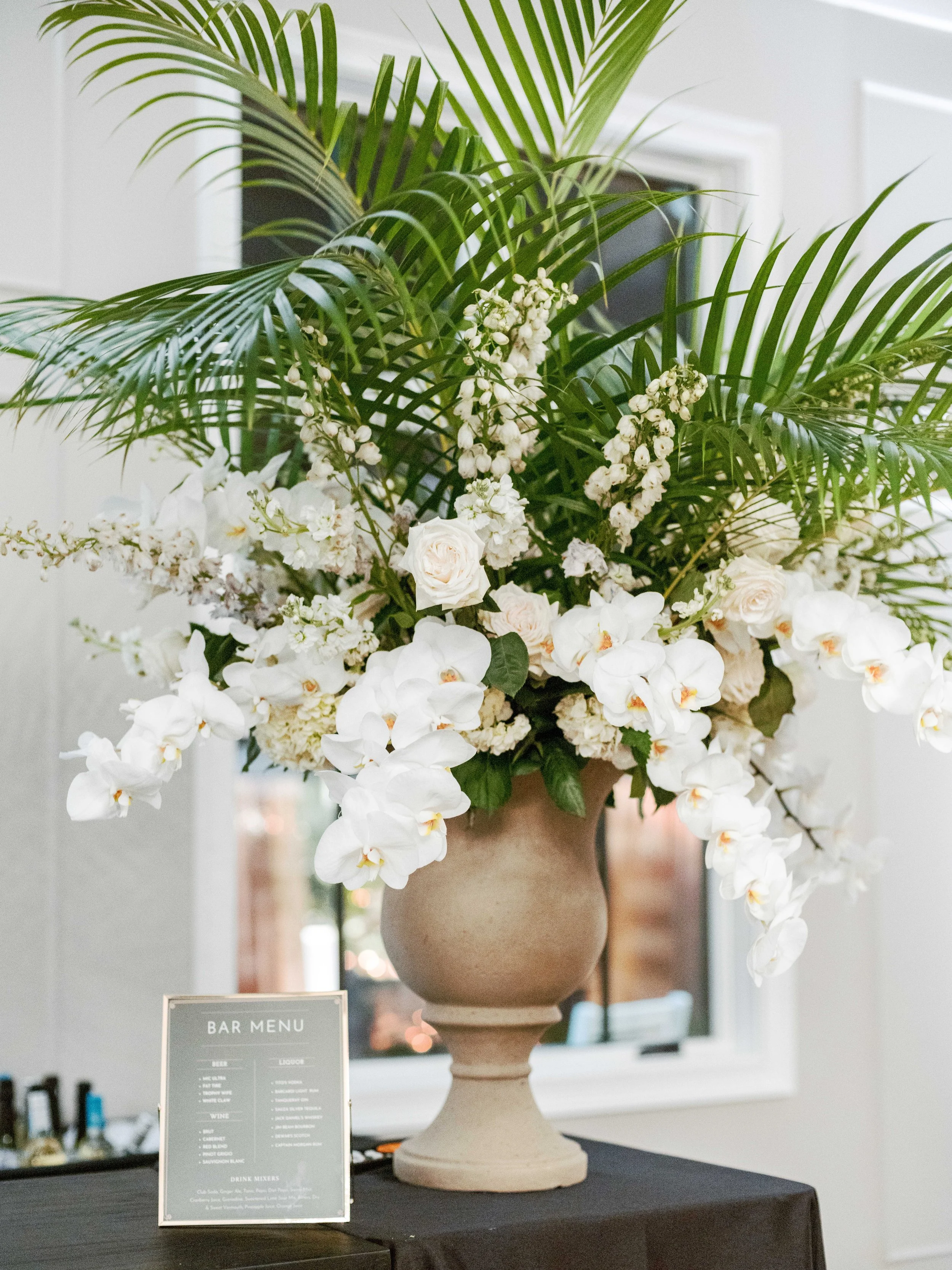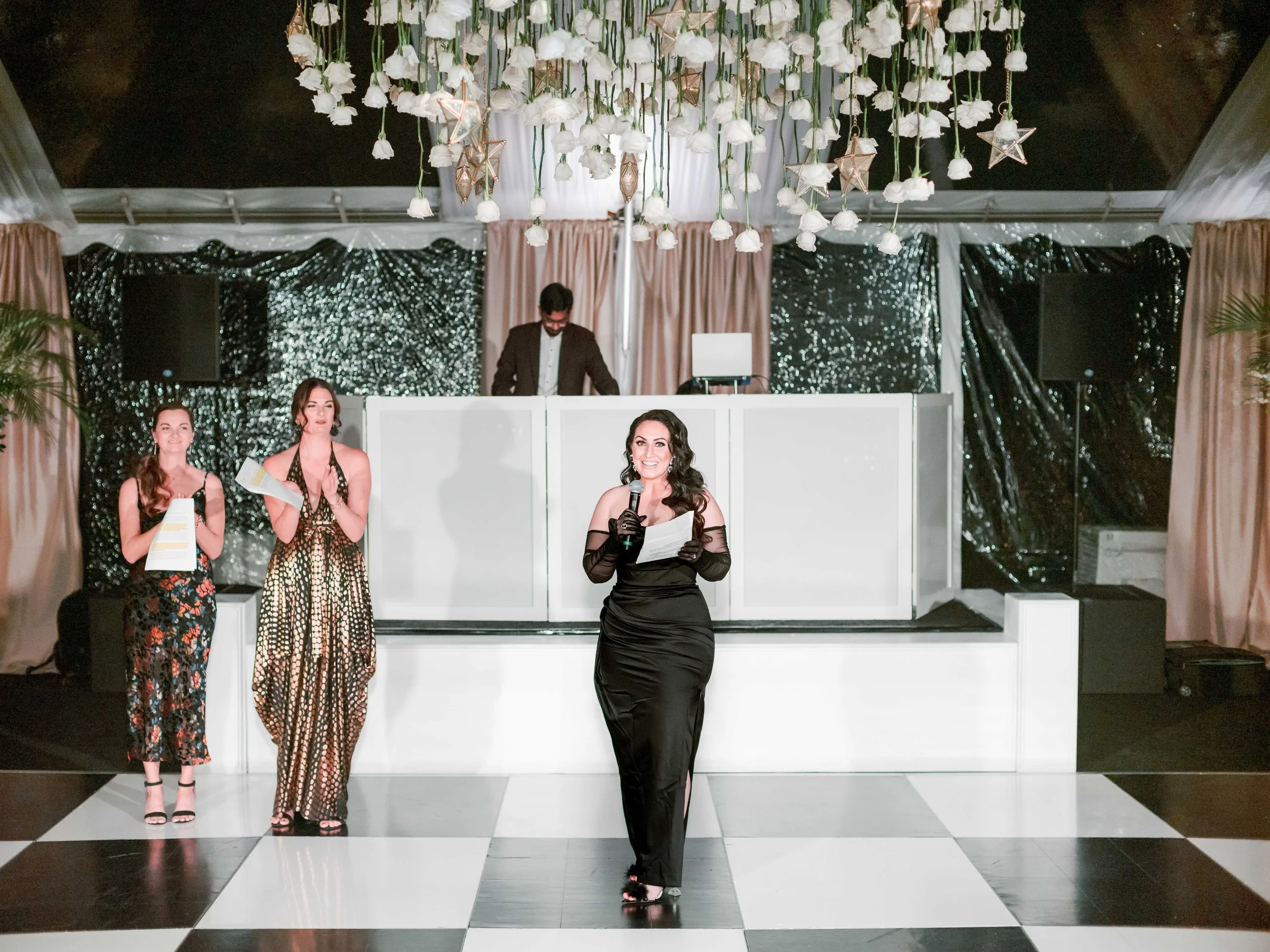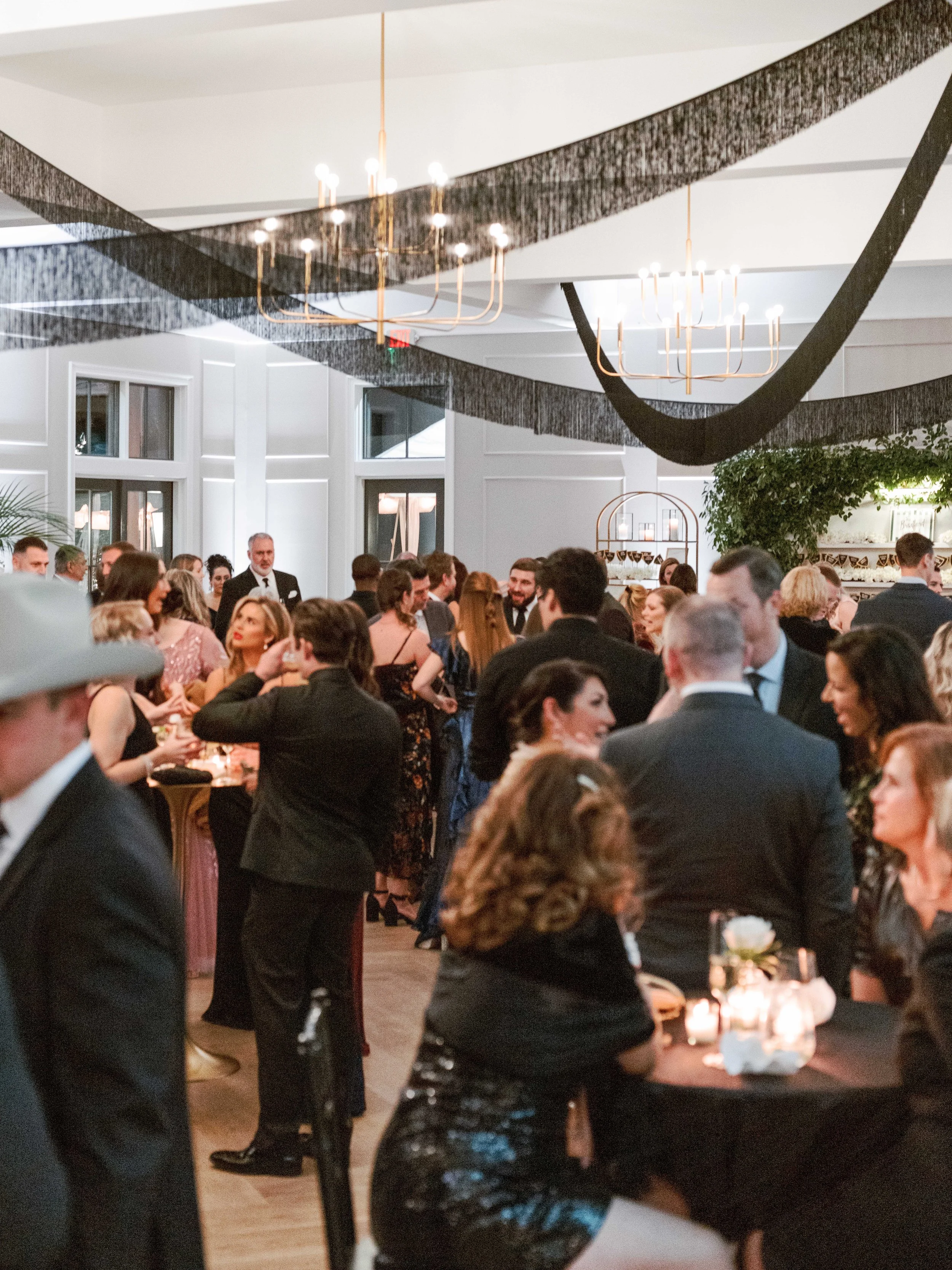 Guests were greeted upon arrival with trays of champagne as they headed to the courtyard to walk the red carpet. Cocktail hour was hosted in the main ballroom, where a live jazz band performed. The highlights of the cocktail hour design were black fringe draped through the ceiling and a floral wall seating chart of escort cards on display that mimicked famous Beverly Hills signage. Attendees took advantage of the photobooth, a watercolor artist offering portraits on-site, and a bit of shopping at the on-site Kendra Scott jewelry pop-up.