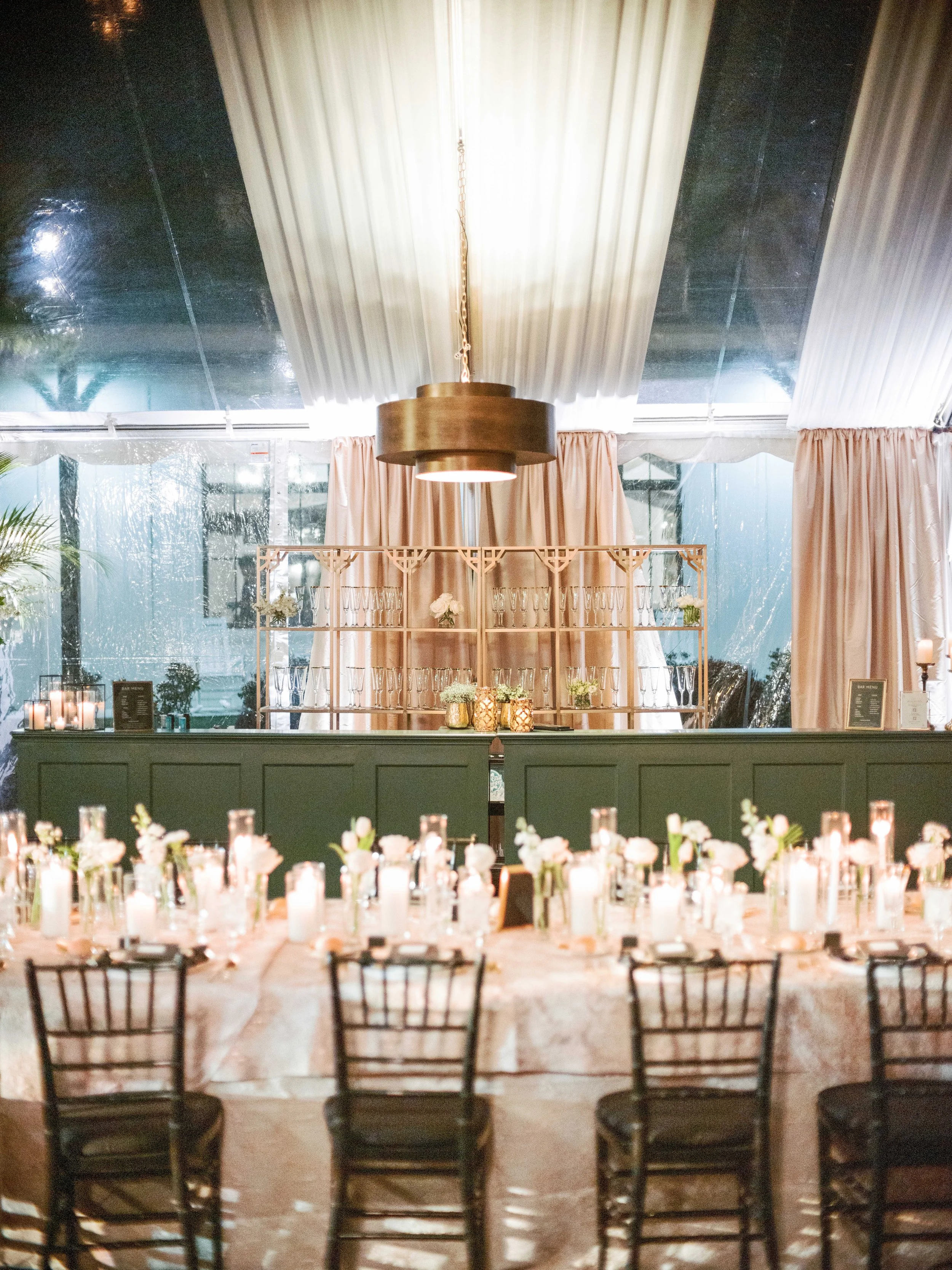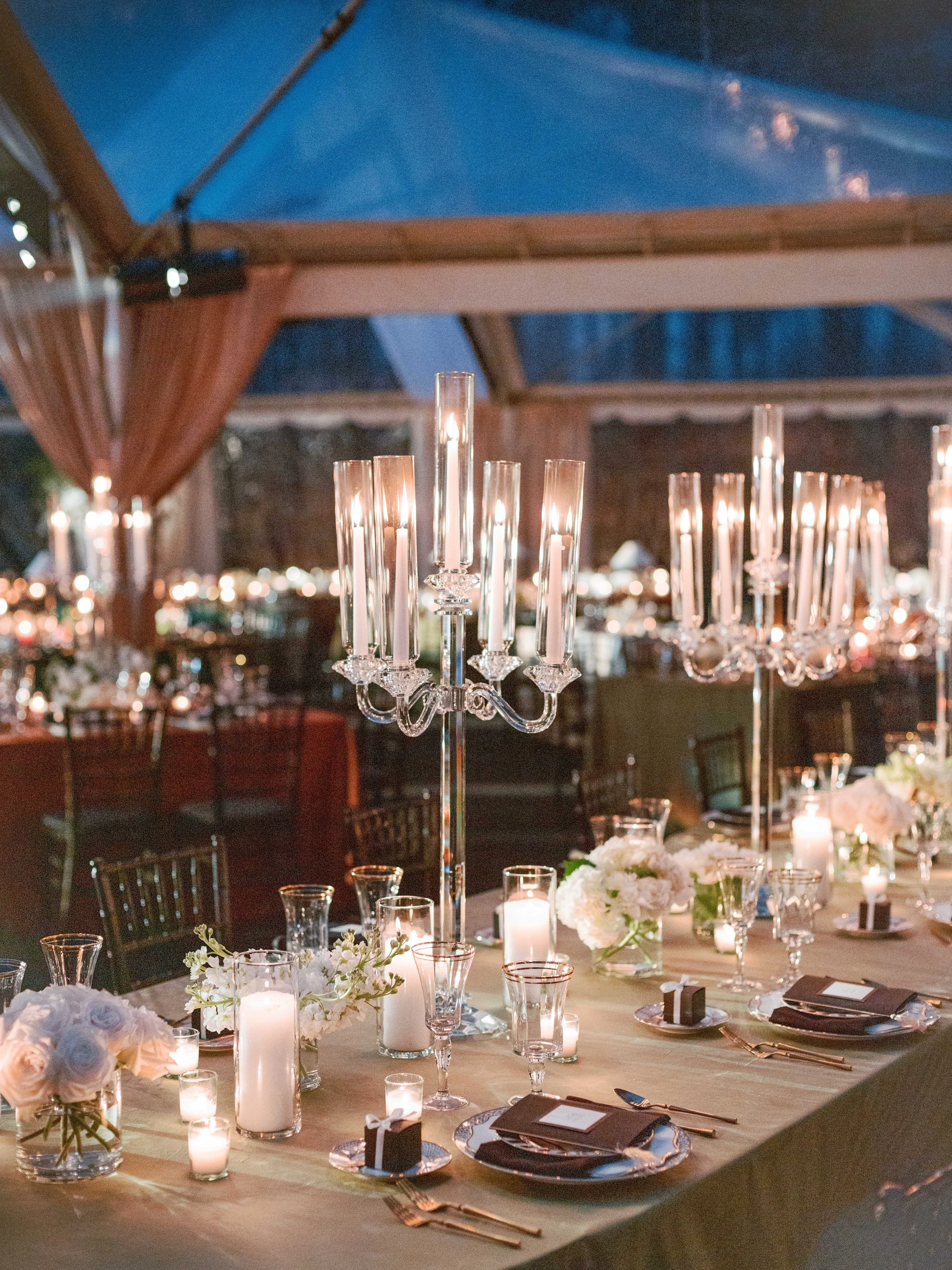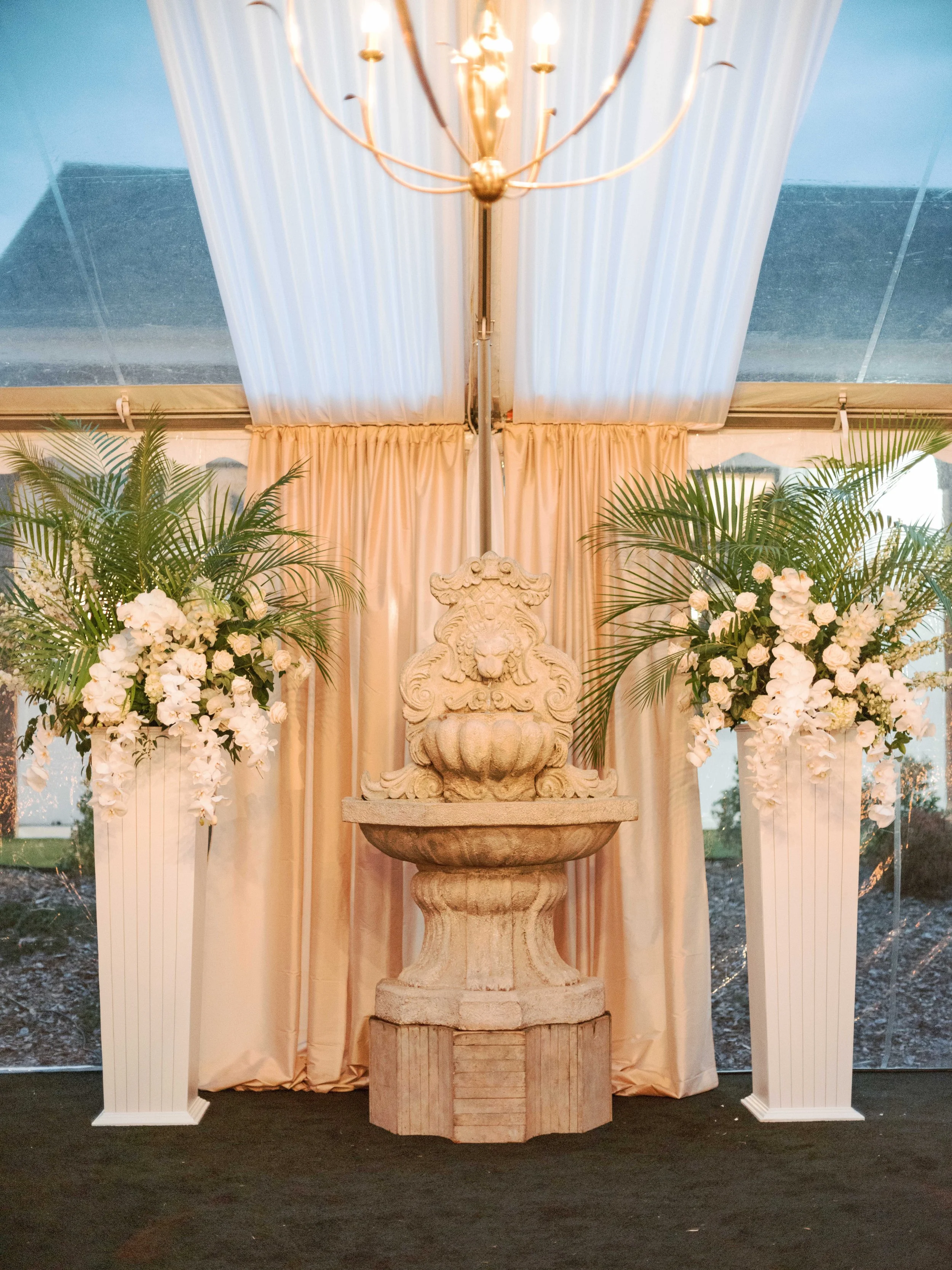 As guests were later invited out into the tent for dinner, they were instantly captured by the mesmerizing ambiance set by extravagant candelabras, luxe linens, cabaret-style seating, and expertly layered tablesettings. There were numerous impactful details to elevate the experience, from an actual working fountain in the tent to individual boxes of gourmet chocolates at each guest’s placesetting. Floral arrangements included white roses, orchids, and regal palm leaves for those true California vibes.