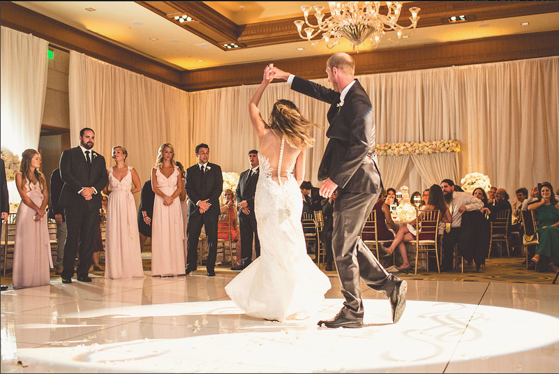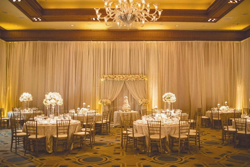 Watered Garden transformed the outdoor ceremony lawn by creating one of the most beautiful structures we’ve ever seen, an arbor covered in fabric and flowers framing the fountain in the background. Jess and Mike made their vows to each other under this beautiful and unique arbor, then the design was carried through down the aisle with white rose petals, draped fabric and florals from chair to chair. If you think this sounds like a fairy-tale, wait until you hear about the ballroom! Themeworks did an amazing job draping the entire ballroom in soft, white, flowing fabric that provided the perfect backdrop for the elegant design of the room. A white dance floor and some soft warm uplighting transformed the space into an elegant dream!
