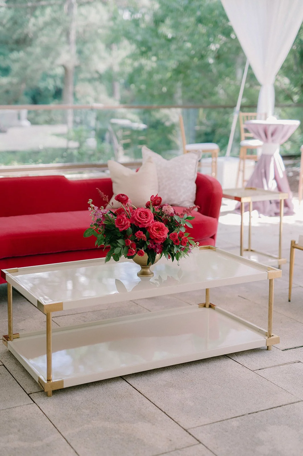 The couple exchanged vows under a dramatic arch on The Umstead lawn. Due to the change in wedding months, we wanted to ensure guest comfort at the cocktail hour and opted to tent the terrace to provide shade. During cocktail hour, guests mingled around a modern glam lounge vignette complete with the most exquisite hot pink sofa.