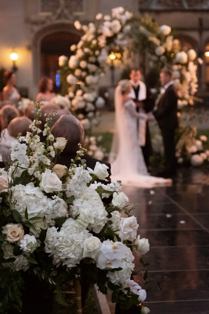 A black monogrammed aisle led Taylor, escorted by her father, to Clark. A stunning floral arch and chandeliers served as the backdrop for their nuptials, without competing with the beauty of the Vanderbilt mansion in the background. As they said their vows, the most breathtaking mountain mist rose around Taylor and Clark and their guests. It was an incredibly beautiful ceremony and an unforgettable experience.