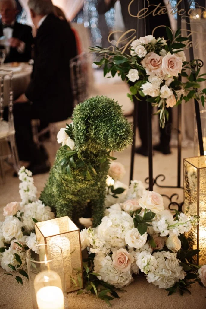 Floressence Flowers also helped honor Moses through dog topiaries that served as a whimsical entrance to Taylor and Clark’s elegant blush and white tented reception.