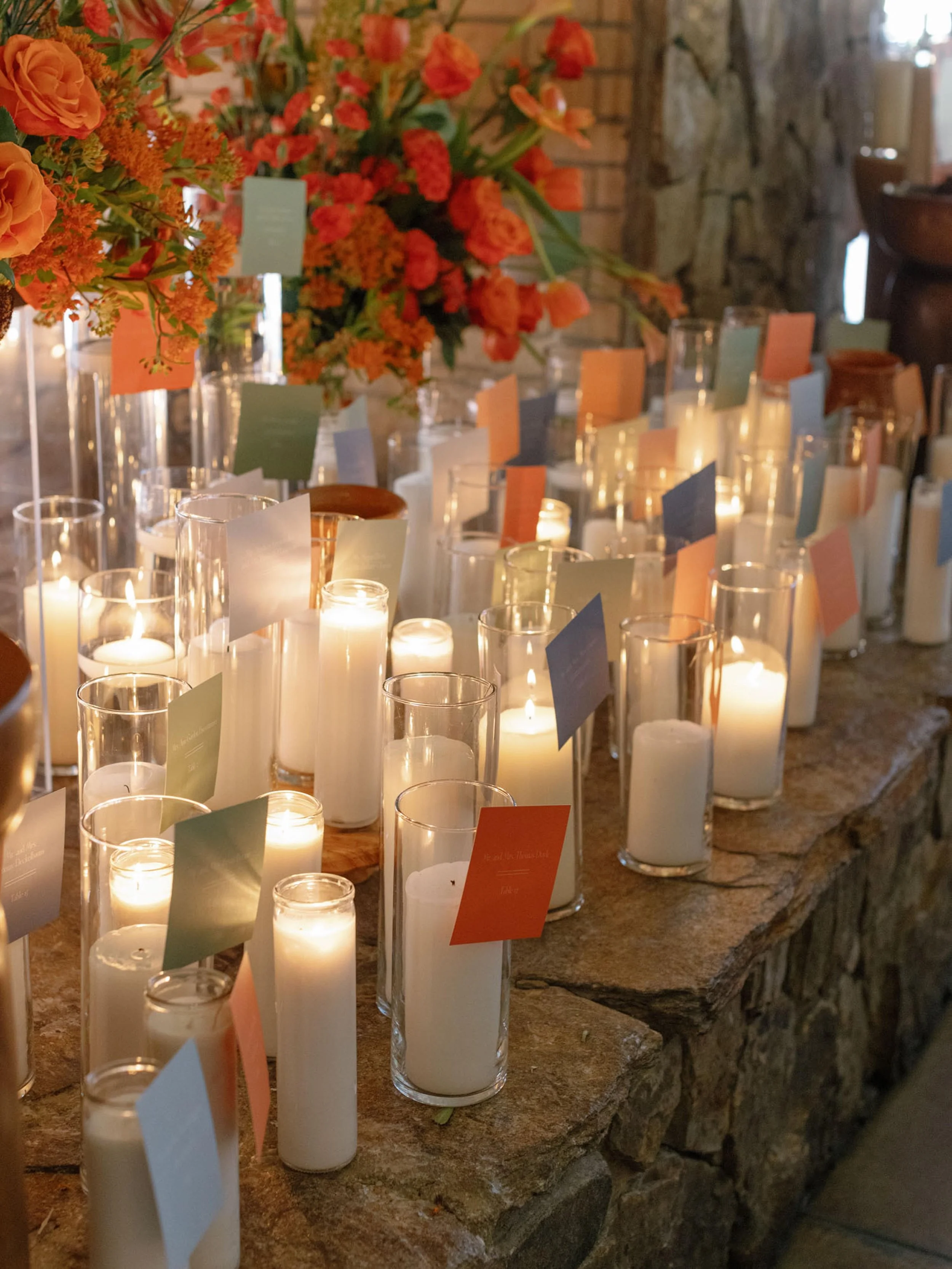 Inspired by Mexican ofrendas, this interactive escort display invited each guest to light a candle behind the couple, creating a living installation of light, love, and community.