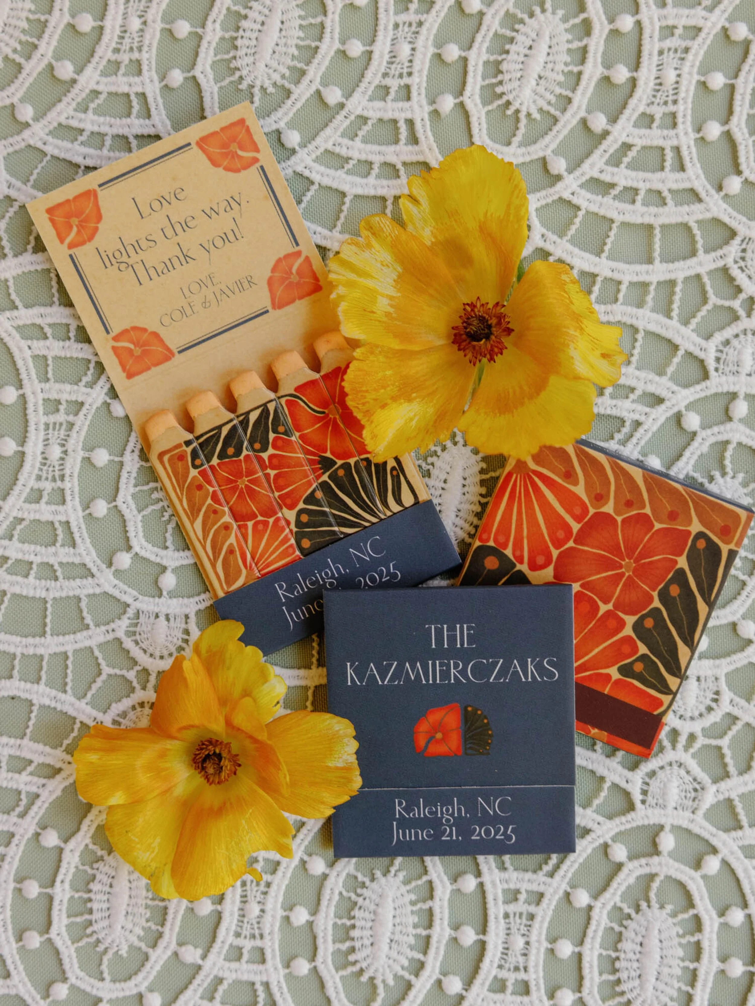 Custom matchbooks, featuring the same motifs from the invitation suite, were displayed as part of the escort card installation and doubled as thoughtful favors.