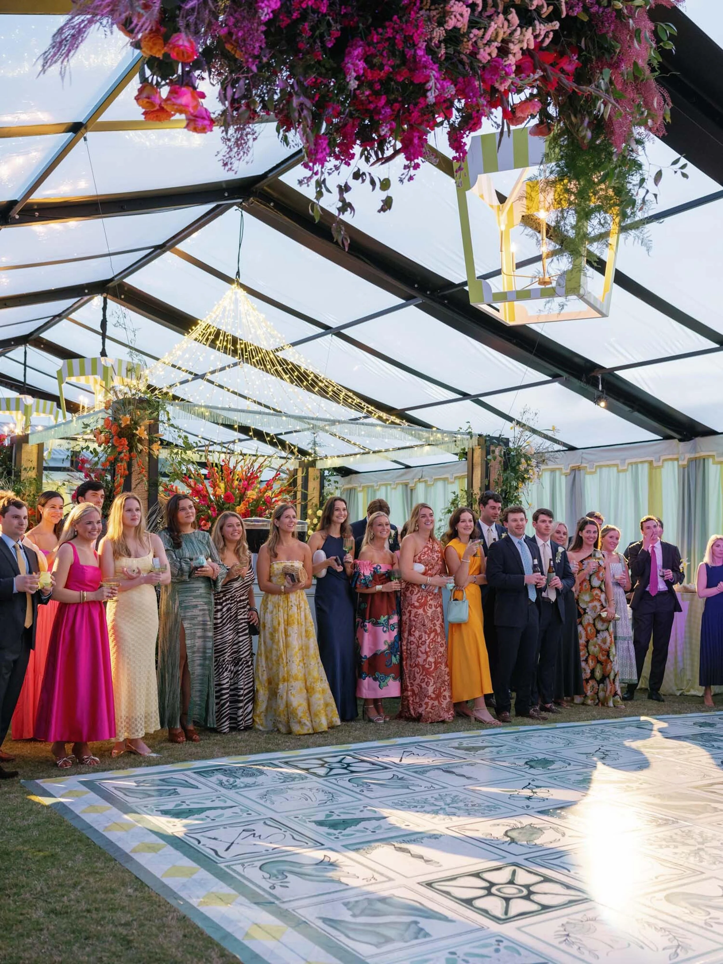 The dance floor featured custom tiles adorned with story-driven motifs, weaving personal details into the design and creating a one-of-a-kind backdrop for the evening’s celebration.