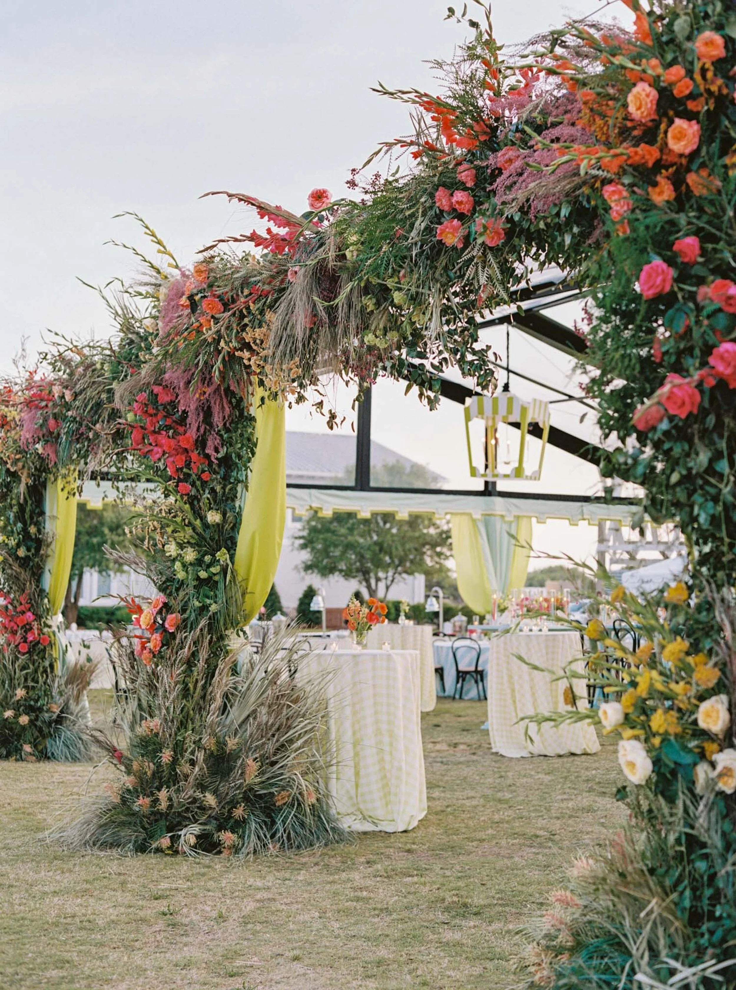 Rattan chandeliers were dressed with soft mint trim and cascading florals. Suspended beneath the black structure, they added texture, movement, and a touch of whimsy that perfectly balanced the vibrant coastal design.
