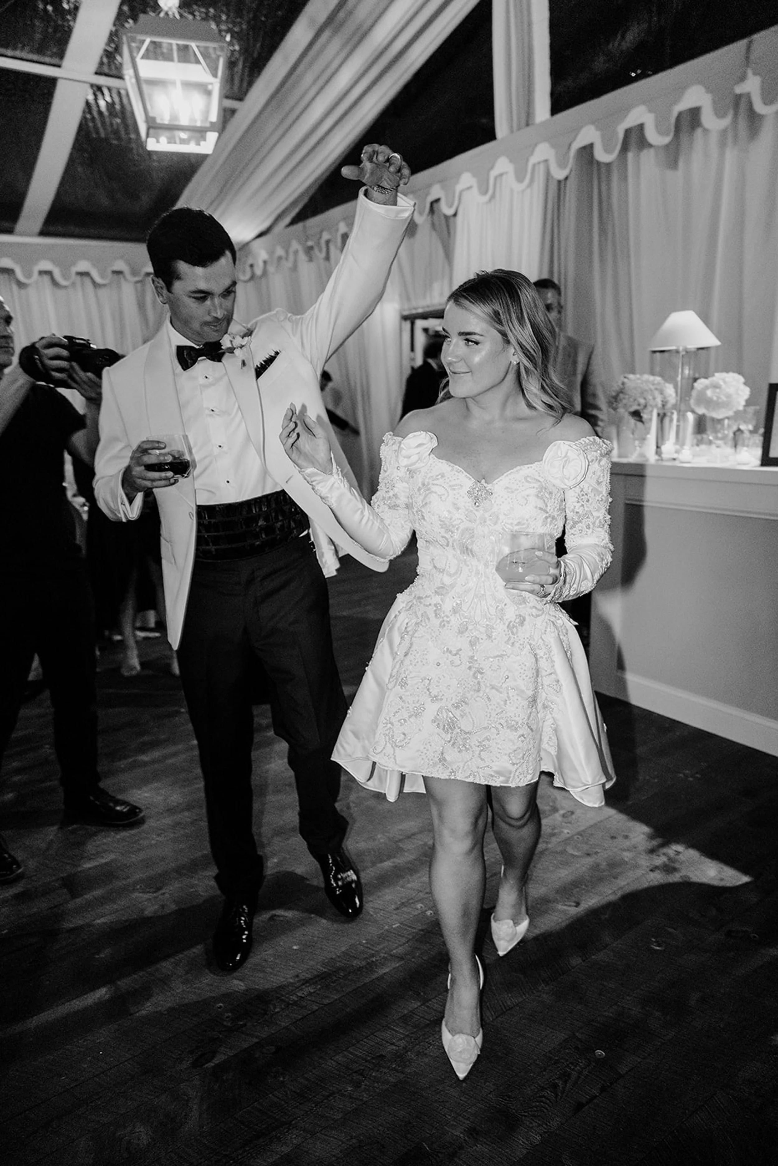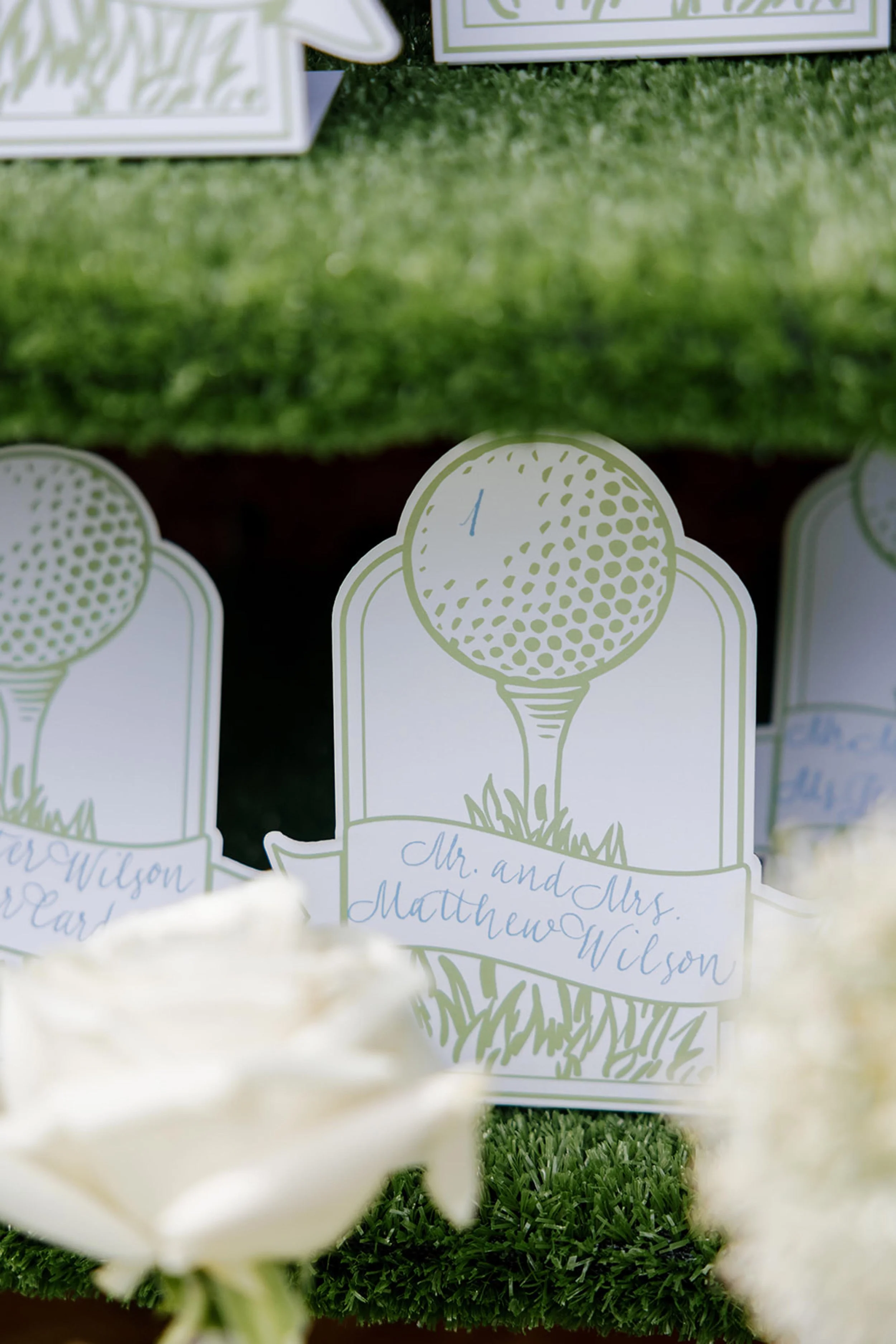 The seating chart embraced a playful golf theme, featuring monogrammed ball buckets and a “Fore-ever” flag, while servers in custom caddy vests reading “Wilson” passed champagne after the ceremony.